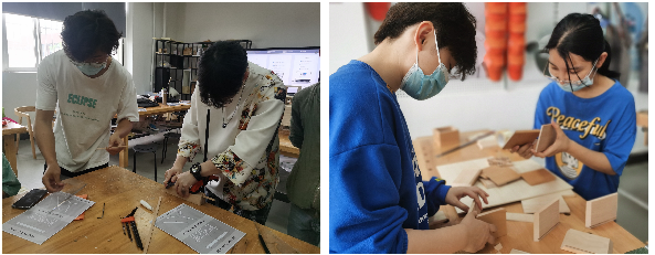 5月19日,上午八点半,艺术设计学院模型材料与制作实验室(19-306)举办的“创新组子细工技能培训”活动正式拉开帷幕,活动主题结合近期《专题设计3——家具设计》、《产品结构设计》、《产品模型设计》等课程,开展教学延伸和组子细工技术交流及创新活动。本次活动为期两天,由实验实训中心主办,武汉世鑫致远科技公司提供技术支持,实验员谌继军老师和模型实验室教师团队负责人王纯老师共同策划和具体实施进行。实验实训中心王茹老师和学生团队肖雯晓、熊千硕、王硕等十多人参与。同时产品20级学生在李涛老师、李莎莎老师的带领下也闻讯而至进行参观学习。